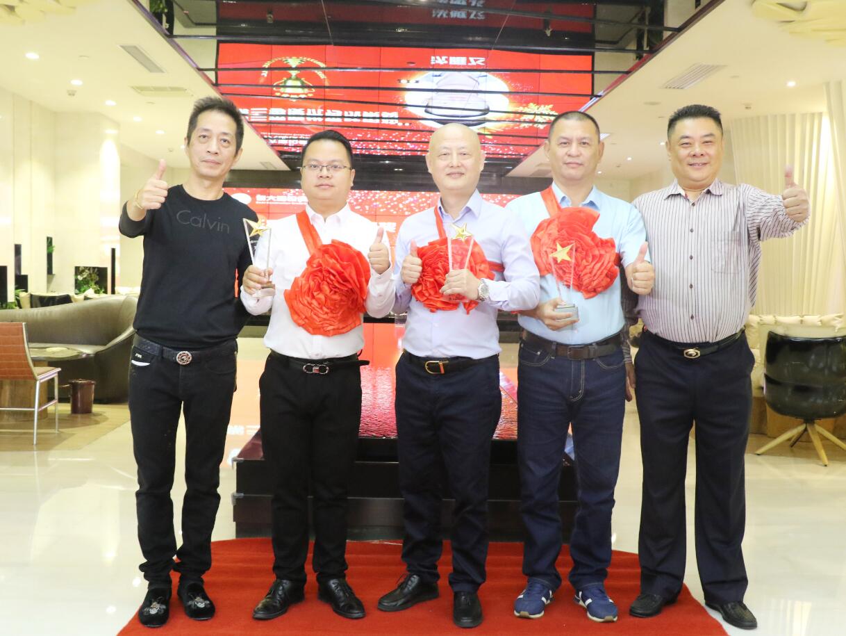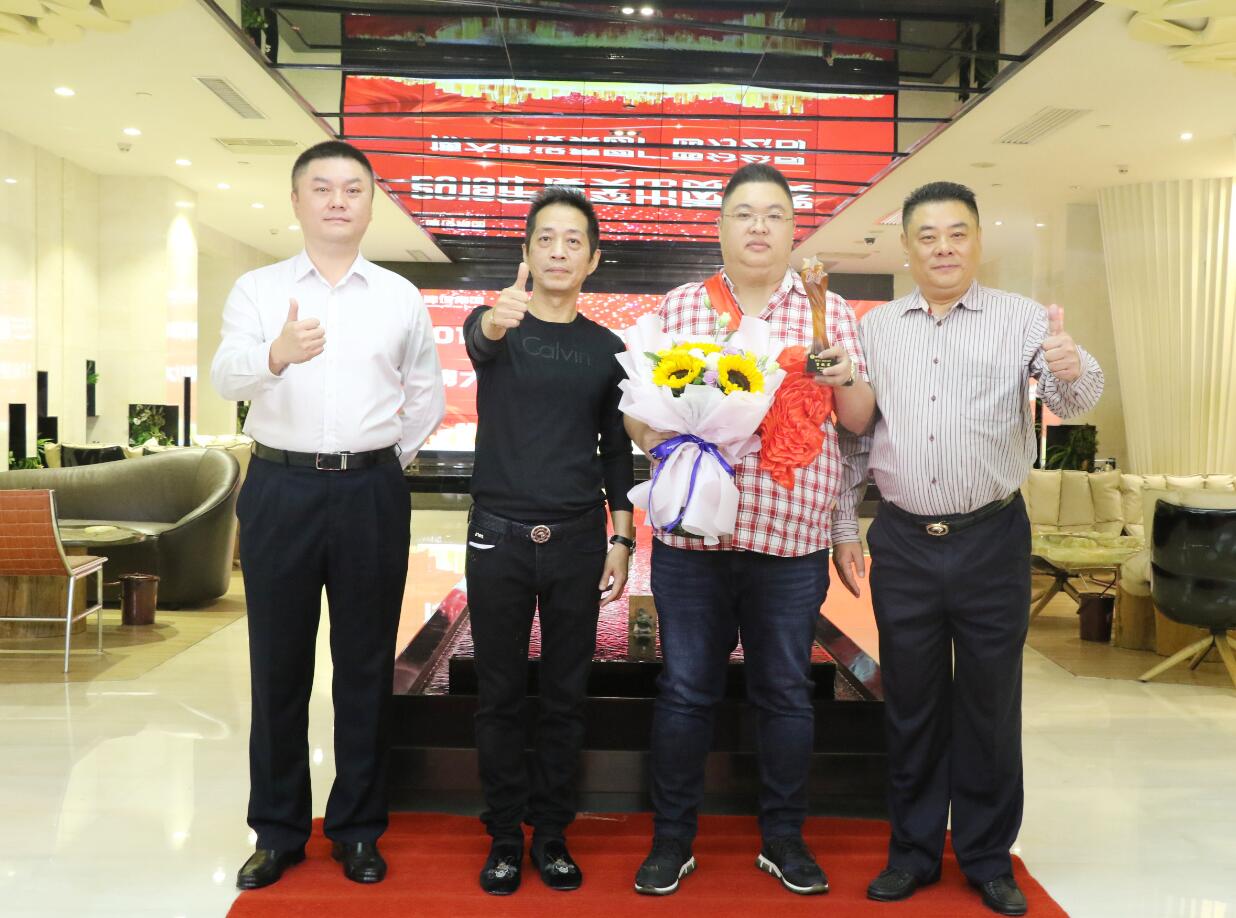 集團常務副總裁沈雁飛在集團業務拓展中做出突出貢獻,被授予優秀成果獎,獎勵10萬元。圖為徐凱宏董事長、黃河副董事長與獲獎者合影留念。
