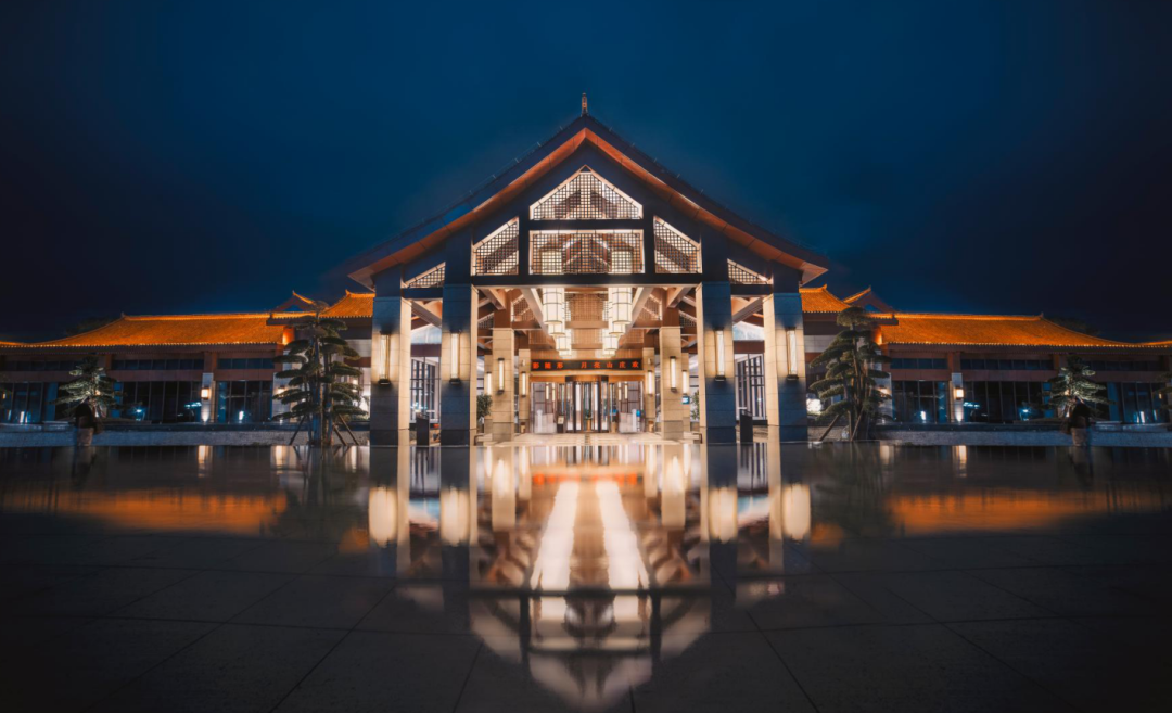 9#樓與8#樓互成犄角之勢,主要功能為酒店大型宴會之所,同樣為扇形建筑體、網架鋼結構屋面。通透的山水畫沖孔鋁單板輔以木紋造型鋁板包梁,述說著貴州山水的靈性,也貫穿延續(xù)了整體建筑風格。