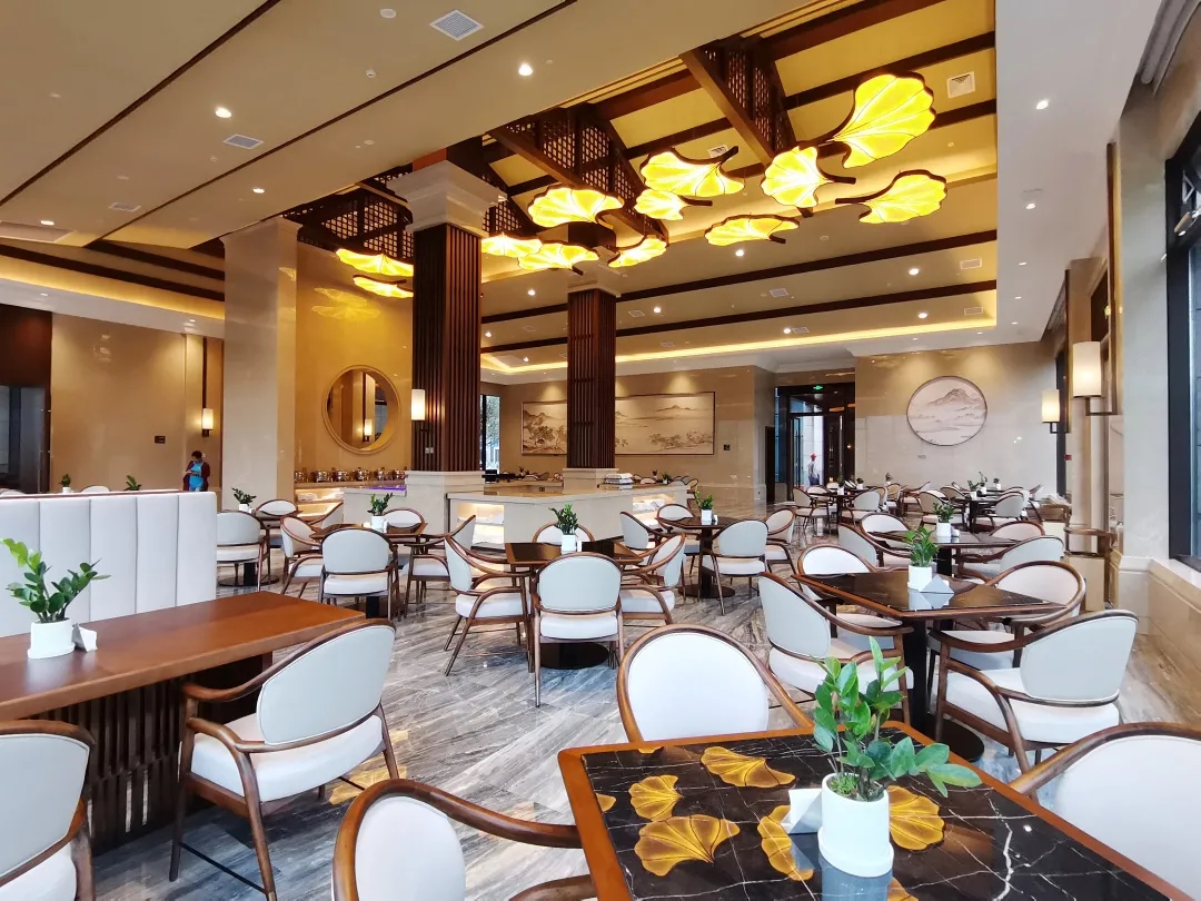 通透的全日制早餐廳,為客人帶來愜意的用餐時光。捫布硬包質感素雅,晶瑩剔透的大理石地面及布菲臺,打造此現(xiàn)代明快的用餐空間。